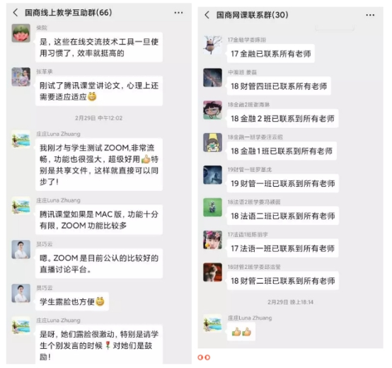 研究生教学、本科生教学也在分管领导、系主任和相关老师多次在线开会沟通下,分别定下网上在线授课的执行方案和预备方案,为了保障网上教学质量和师生的良好体验,学院还特别组建了专为解决教师线上授课帮扶的“线上教学教师互助群”、专为保证教学效果沟通的“网课师生联系群”、专为学生之间共享学习资源互助共进的“线上学习学生互助小组群”和专为加强海外学生管理引导服务的“海外交换学生交流群”,确保所有方案和措施在党政充分沟通、师生充分沟通基础上实现周密计划、有力执行和充分保障。3月4日,在学校领导检查新学期本科网络教学工作中,检查组观看了学院员巧云教授和曾宇丹老师的课程,对新形势下学院老师的网络教学给予了充分肯定和高度评价。截至3月6日,在第一周课堂质量评价中,网络教学任务圆满完成,教师重视程度较高,教学方案准备充分,师生教学沟通到位,学生满意度很高。