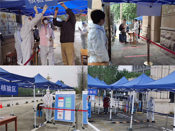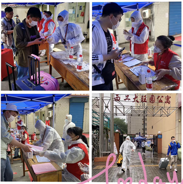 在友谊校区南门、长安校区西门学生进校接待点,机关党员干部早上八点前即开始工作准备。在学生陆续到来时,引导学生在专门搭建的雨棚下间隔1米有序排队检测登记。干部们细心地帮助学生换口罩、测体温、消毒,引导学生在“核验区”人脸识别注册、扫码确认,安排确认正常的学生回到宿舍。