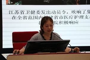 分享会首先由南京医科大学附属南京医院医政处马敏星主任播放了南京援鄂二队抗疫宣传片《江域战疫,勇士逆行》。该片真实记录了该院医护人员快速响应政府号召、请战逆行,武汉抗疫奋战拼搏,最终完胜凯旋的场景。鲜活的镜头深深震撼着在场每一位教师,深切感受到了医者仁心的激情和速度。