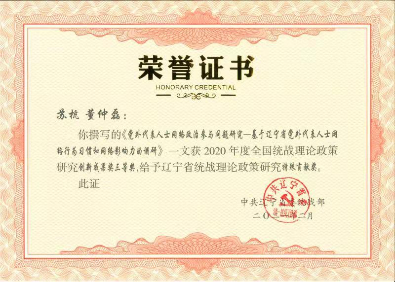 统战理论政策研究创新方面,2020年我校获统战理论研究立项课题共7项,均已结项,此次有6项课题研究成果受到表彰奖励,其中党支部教工党员董仲磊《党外代表人士网络政治参与问题研究——基于辽宁省党外代表人士网络行为习惯和网络影响力的调研》课题荣获全国统战理论政策研究创新成果三等奖。此外学校还获得全省统战理论政策研究创新成果二等奖1项、三等奖1项;全市统战理论政策研究创新成果一等奖2项,二三等奖各1项。