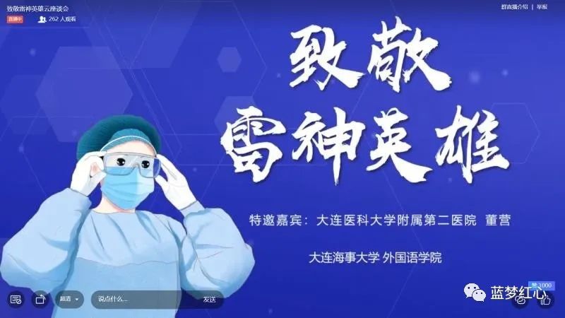 2020年4月22日14:00,外国语学院本科生第一党支部与大连医科大学附属第二医院驰援医生董营举办了云座谈会,本次云座谈会由蒋娇老师主持,外国语学院本科生第一党支部的同学们参与此次座谈会。