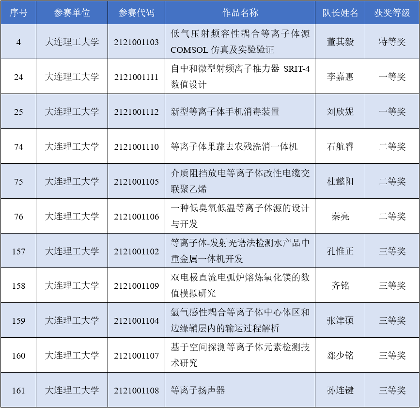 最终,我校参加初赛和决赛的11支队伍均取得了优异的成绩。在本届竞赛本科生和研究生同场竞技的情况下,我校本科生作品《低气压射频容性耦合等离子体源COMSOL仿真及实验验证》(物理学院,指导教师:张莹莹、宋远红)荣获特等奖,是15支获得特等奖队伍中为数不多的本科生队伍。作品《自中和微型射频离子推力器SRIT-4数值设计》(航空航天学院,指导教师:夏广庆、孙斌)、《新型等离子体手机消毒装置》(生物工程学院,指导教师:杨君)获一等奖;作品《等离子体果蔬去农残洗消一体机》(物理学院,指导教师:杨德正)、《介质阻挡放电等离子体改性电缆交联聚乙烯》(电气工程学院,指导教师:姜楠)、《一种低臭氧低温等离子体源的设计与开发》(物理学院,指导教师:杨德正)获二等奖;作品《等离子体-发射光谱法检测水产品中重金属一体机开发》(物理学院,指导教师:杨德正)、《双电极直流电弧炉熔炼氧化镁的数值模拟研究》(电气工程学院,指导教师:王振)、《氩气感性耦合等离子体中心体区和边缘鞘层内的输运过程解析》(物理学院,指导教师:赵书霞)、《基于空间探测等离子体元素检测技术研究》(物理学院,指导教师:杨德正)、《等离子扬声器》(电气工程学院,指导教师:张颖杰)获三等奖。