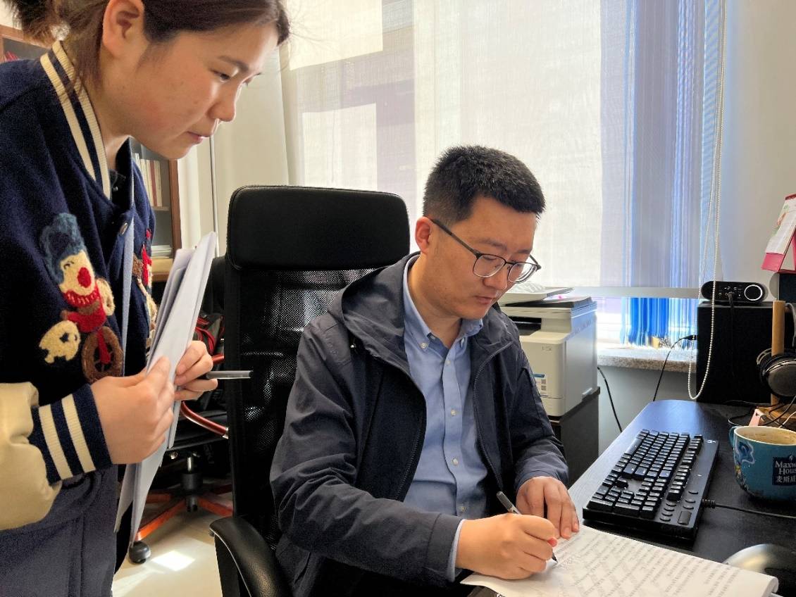 化工学院陶胜洋教授住校期间与学生讨论科研合同签订事宜。