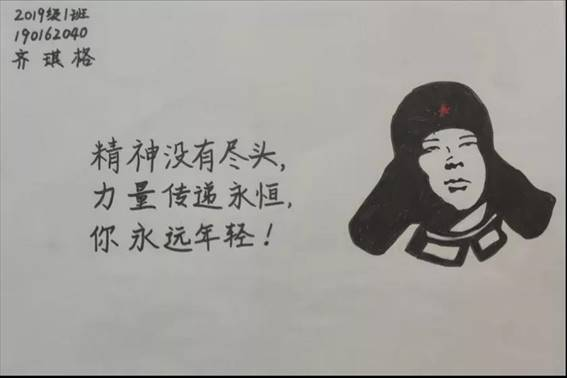 以前辈之精神,勉吾辈之正气;三行文字,纸短情长;是对雷锋精神的赞扬,更是对新一代青年人的勉励。