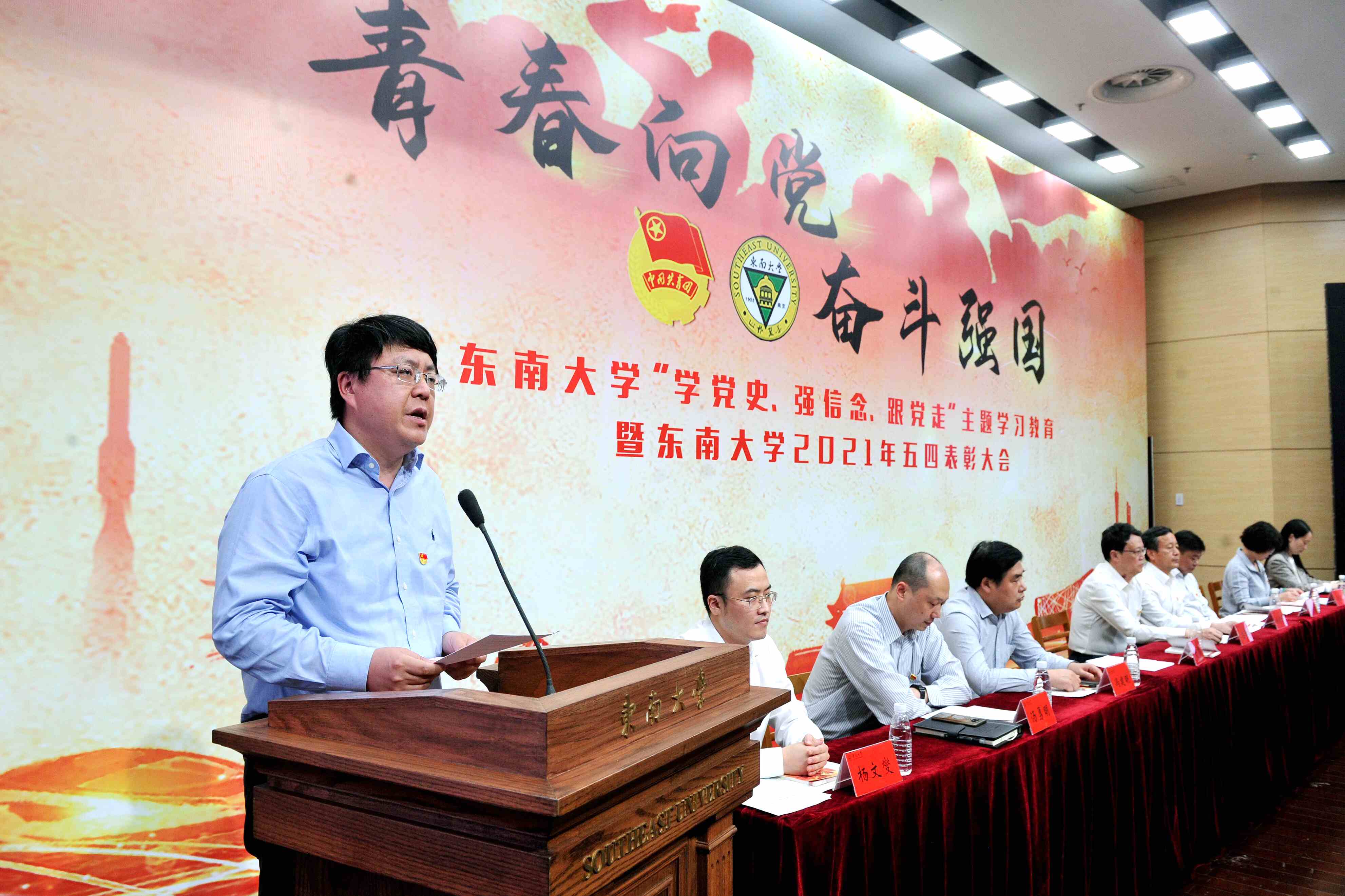 【东大新闻网5月2日电】(通讯员 张玉灵 摄影 曲钢)4月30日下午,“青春向党,奋斗强国”东南大学“学党史、强信念、跟党走”主题团日活动暨东南大学2021年五四表彰大会在九龙湖校区润良报告厅举行。校党委书记左惟,校党委副书记郑家茂、刘攀以及党委办公室、党委教工部、党委学工部、党委研工部、校工会等职能部门负责同志,校团委全体同志,各学院党委副书记出席了大会。获奖师生代表、各学院团委负责同志以及部分优秀团员代表共500余人参加了大会。