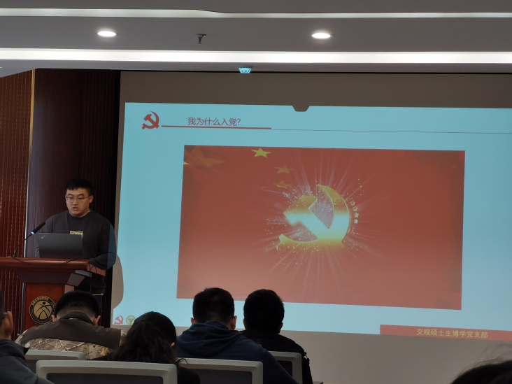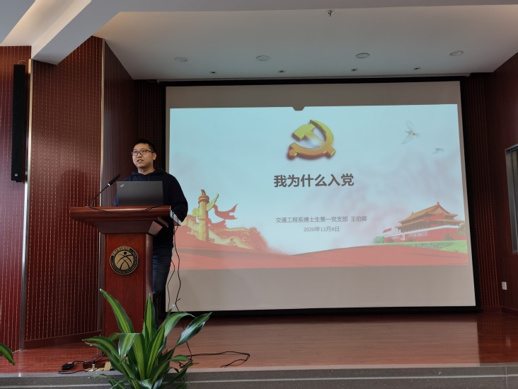 交通工程系博士生第一党支部书记王伯卿同志,带领大家回顾了党章关于定义、宗旨的内容,分享了自己入党七年以来关于“为什么入党”的反省和认识。王伯卿同志详细阐述了自己的三条理由,强调“为人民服务”既是党员的基本要求也是终身奋斗目标,要求党员同志在中国特色社会主义建设的新时期勇担责任、做出贡献。