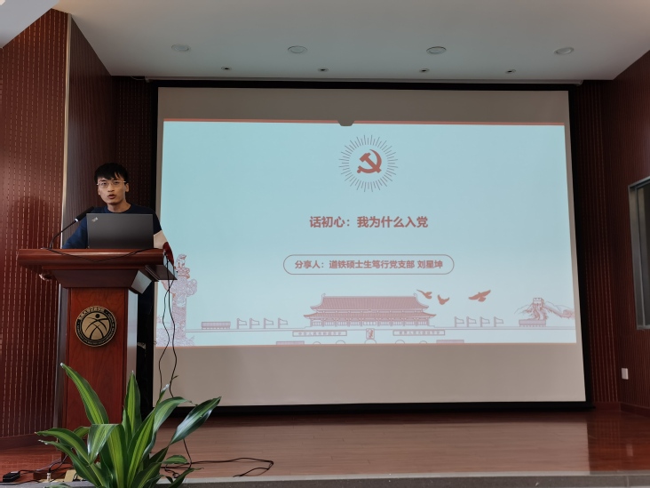 道铁硕士生笃行党支部书记刘星坤同志,继续探讨为什么入党的问题。他用诚恳生动的语言介绍了自己对这个问题的思考过程,给出了三个阶段、四种答案,层层递进,在批判式思考中探寻问题的解答。刘星坤同志强调,如果党员同志被功利想法蒙蔽了双眼,一定不会走的长远。他呼吁,党员同志要“跟随先锋模范的潮流,努力成为更优秀的人,成为他们那样的人”,并且在未来“成为榜样去引领下一个人”。最后,刘星坤同志阐述了自己理解的、具体的入党动机,内容切实,发人深省。