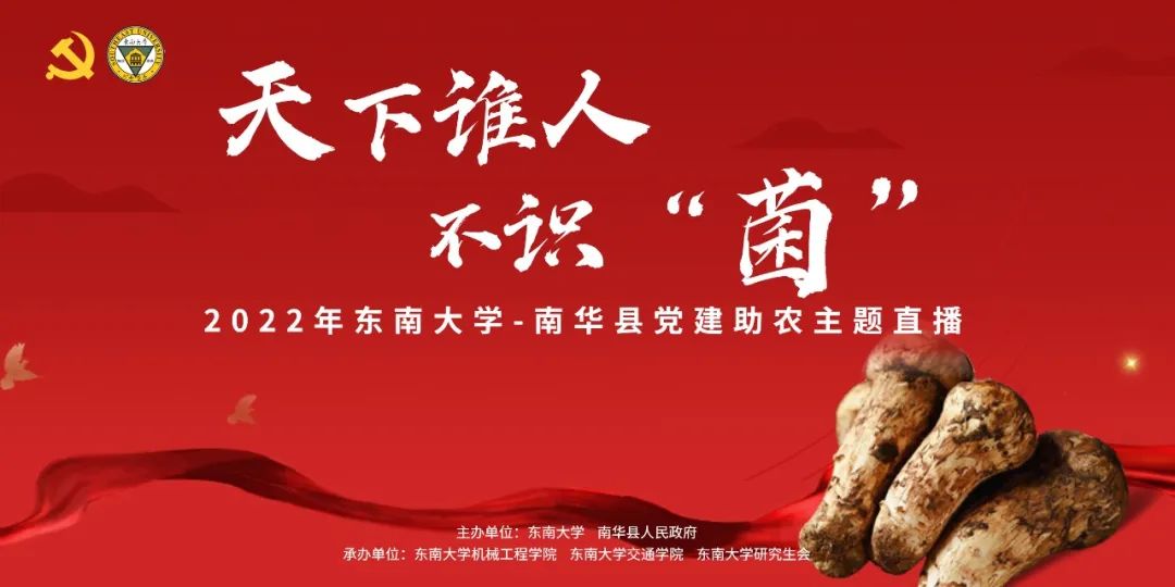 2022年8月8日东南大学交通学院本科生以升社区党支部联合东南大学机械工程学院“筑梦彩云”实践团、东南大学第24届研究生支教团南华分队共同开展了“天下谁人不识‘菌’!2022年东南大学-南华县党建助农主题直播”,目的是以野生菌和产业先锋为主题进一步宣传南华县的特色农副产品,助力南华县产业振兴。同时,本次活动还作为南华县2022年野生菌美食文化节和第一届电商节的“东大会场”,与南华县的盛大节日两地辉映。本科生以升社区党支部钟嘉媛同志和机械学院苏文烨同学作为主持人。