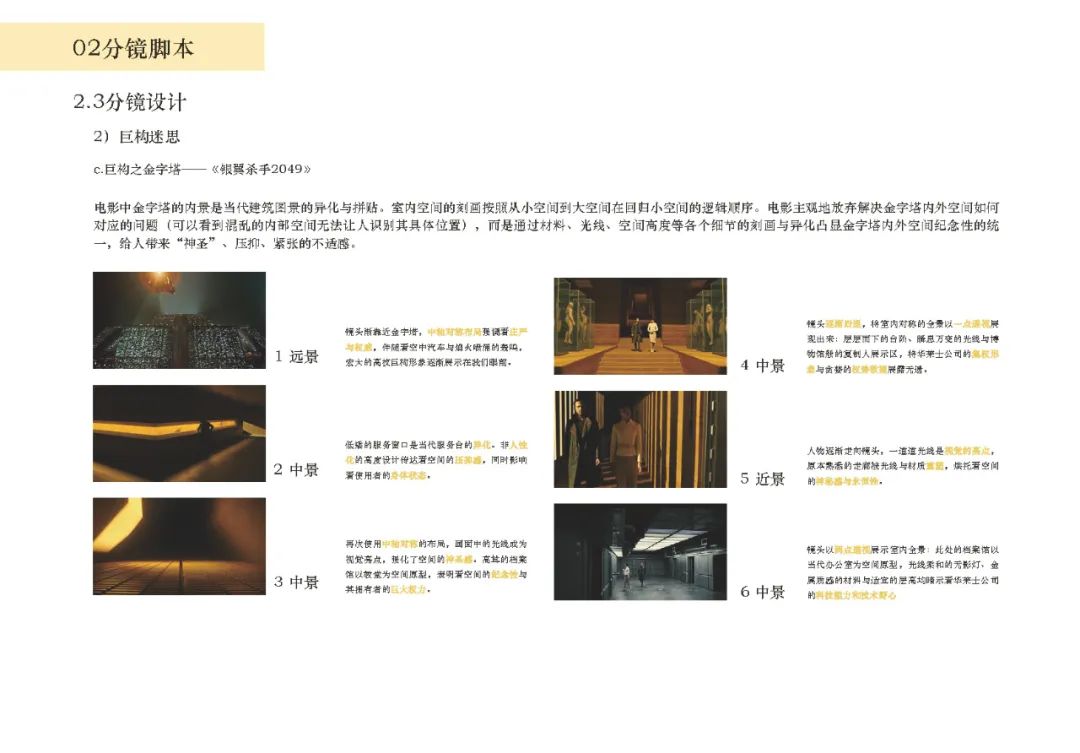 后者聚焦于“技术”,并将其置入“反乌托邦”的特定主题,以此有力地揭示出,在剥离了这一概念物质性的功能以后,它们依然承担着表达某些“意义”的职责,有时还被赋予相应的意识形态倾向。相关论证通过对具体场景的解读逐步展开,暴露的结构构件,反射性的表面质感,闪烁的屏幕等要素都成为指涉“技术”的符号,并通过无限延伸的轴线、对称式布局、超大规模的尺度等知觉特征嵌入了一种高度理性化了的氛围当中。