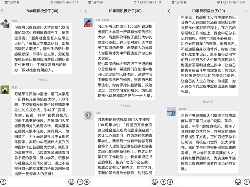 各支部组织党员和入党积极分子认真学习了习总书记的贺信,并通过腾讯会议、微信等平台交流了对习总书记贺信精神的学习体会与收获。