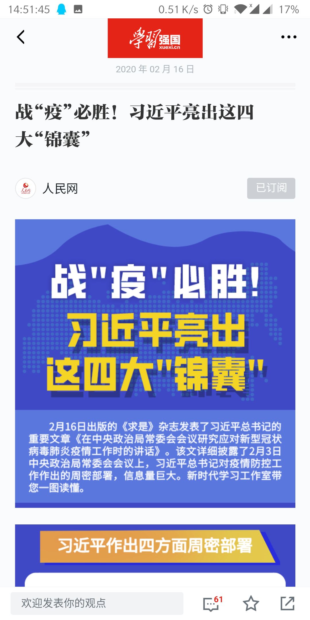 “我们一定会胜利!”这是我最深的感受。截止2月14日24时,各地共派出217支医疗队,25633名医疗队员,这是我们攻克这场战“疫”的将士;在科研战线对新型冠状病毒的分离、药物和疫苗的研制,到医疗战线中西医结合运用治疗,再到科技战线无人机、人工智能、大数据的运用,这是我们抗“疫”的武器;沈阳捐赠130吨白菜、内蒙古130吨土豆、江西160吨萝卜,还有黑龙江的3000吨大米,山东的2300吨的蔬果和其他省份的捐赠物资等等,这是全国各地的爱,是支援战“疫”一线的粮草;2月16日出版的《求是》杂志发表了习近平总书记的重要文章《在中央政治局常委会会议研究应对新型冠状病毒肺炎疫情工作时的谈话》,这是习近平总书记对疫情防控工作作出的周密部署,这也是战“疫”的指挥!习近平总书记作出“做好疫情防控重点工作”、“做好维护社会稳定工作”、“做好宣传教育和舆论引导”和“保持经济平稳运行”这四个方面的部署。