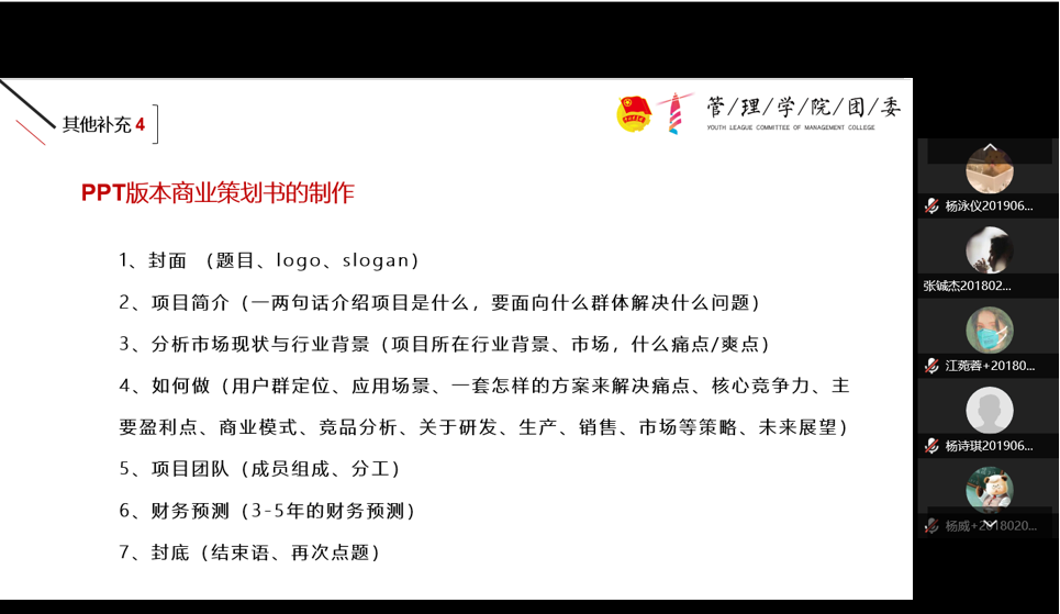 陶慧仪同学以“解读‘互联网+’大学生创新创业大赛”为主题,通过线上讲解和互动提问等形式对“互联网+”大赛的影响力、重要性、赛事特色以及比赛流程进行了解读,重点强调了明确参赛初心的重要性,并在挖掘项目、组建团队及选择赛道组别等方面给出了许多可行性建议。同学们收获颇丰,反响热烈。本次活动加深了管院学生对“互联网+”创新创业大赛的了解,极大地激发了同学们的创新精神、增强创新意识和提升创新创业能力。
