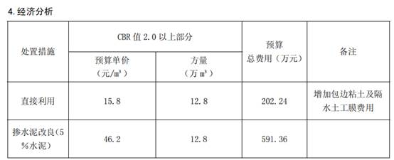 最后通过改良、试验段成功。得出结论本标段原设计为借方段落,附近无合适土源,若将上述17.7万利用方全部作弃方处理,将加重借土困难。因此经广东省交通集团及设计单位共同讨论决定,对上述土方CBR值在2.0以上的部分,利用粘性土包边后,顶层采用隔水土工膜覆盖,分散填筑于93区。从而将弃方变成利用方,又解决了借土困难,且通过上述经济分析,此方案很合理。并且为后期路基交工验收奠定了坚实的基础,在四方联合检测交工验收中各项检测指标合格,尤其是回弹弯沉,全部合格,得到监理、业主单位 的好评。