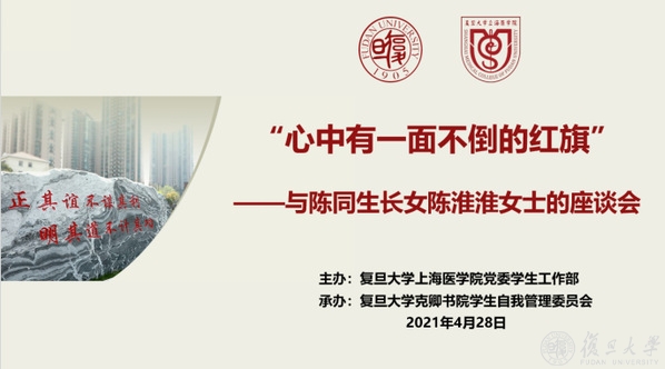 “心中有一面不倒的红旗”——与陈同生长女陈淮淮女士的座谈会由复旦大学上海医学院党委学生工作部主办,复旦大学克卿书院学生自我管理委员会承办。参加座谈会的还有医学学工部老师、医学学工部挂职“人才工程”和“青年复旦”队员以及“红枫”学生骨干培训计划学员。