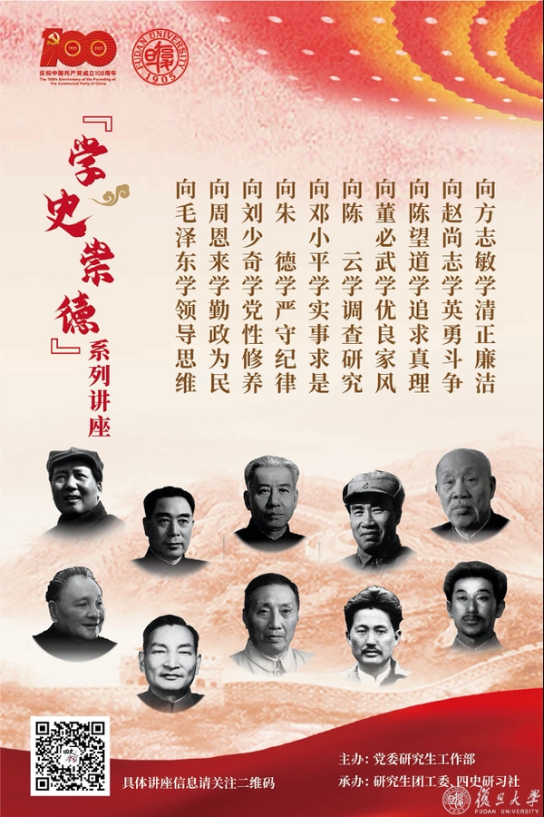 “学史崇德”系列讲座是复旦大学党委研究生工作部主办,复旦大学研究生团工委、复旦大学四史研习社承办的系列党史讲座活动。讲座邀请10位党史人物研究专家聚焦领袖人物、革命先烈的生平事迹和伟大贡献,引领广大在校研究生铭记革命先辈的奋斗历程和崇高风范,争做中国共产党光荣传统和优良作风的忠实传人。系列讲座已经开展3场,覆盖25个研究生党支部约580名研究生党员,其余7场将于5月至6月间开展。