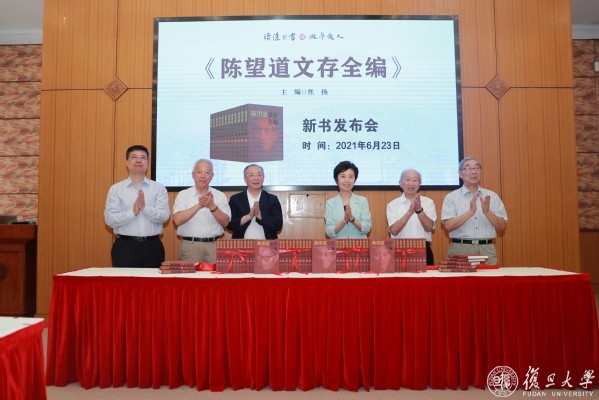 校党委书记、《陈望道文存全编》主编焦扬,第十届上海市政协副主席、上海市教育发展基金会理事长、本书顾问委员会委员王荣华,复旦大学原党委书记、新闻学院教授、本书顾问委员会委员秦绍德,信息科学与工程学院教授、陈望道之子陈振新,国际文化交流学院教授、陈望道学生陈光磊,文科资深教授、校图书馆馆长陈思和,复旦大学出版社党委书记、董事长严峰共同为新书揭幕。校党委副书记许征主持此次活动。出席活动的还有复旦大学教师、陈望道儿媳朱良玉,上海市教育发展基金会秘书长张宏莲等。