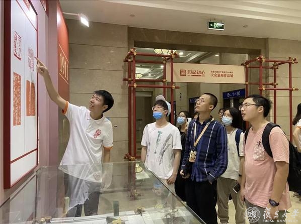 “印记初心——庆祝中国共产党成立100周年大众篆刻作品展”目前正在复旦光华楼志和堂展出,各院系本科生讲解员为新生提供讲解