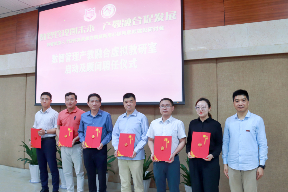 随后,我系主任雷金英从指导思想、总体目标、建设思路、六大任务以及组织实施等方面,汇报了《管理学系数智管理人才培养质量提升方案》。紧接着,“数智管理产教融合虚拟教研室”启动,卢宇副院长为受聘专家学者颁发了顾问聘任证书。