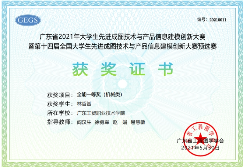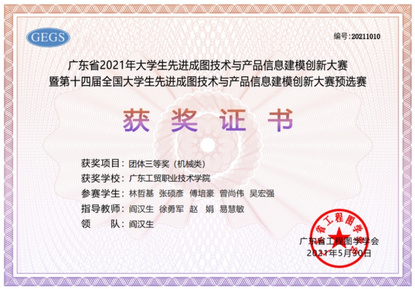 2021年5月29日,第十四届“高教杯”全国大学生先进成图技术与产品信息建模创新大赛广东省预选赛采取线上形式举行。我校机电工程学院由林哲基、张硕彥、傅培豪、曾尚伟和吴宏强5位同学组成团队参加了比赛(指导教师:阎汉生、徐勇军、赵娟、易慧敏)。参加本次比赛的有华工、华农、广工等重点本科院校,还有市工贸技师、肇庆技师等国家重点中专,也有顺职院、机电职院等一流高职,500多名选手不分组别,同台竞技。经过激烈拼搏,我校代表队从机械类370多名选手中脱颖而出,荣获个人全能一等奖1项、二等奖1项、三等奖2项和获团体三等奖的好成绩,并获得参加7月份全国总决赛的资格。
