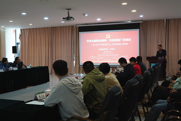 环境监测学院朱称水以《共学全国两会精神,共促美丽广东建设》作主题报告,从2024年全国两会概况、政府工作报告主要内容等方面,带领大家深入学习全国两会精神。他指出,要以学习全国两会精神为契机,共学共促,激发党建新动能,把政治优势转化为事业发展强劲动力;共建共享,提升科研协同创新水平;共办共育,提升产教融合育人成效,共促绿美广东生态建设。