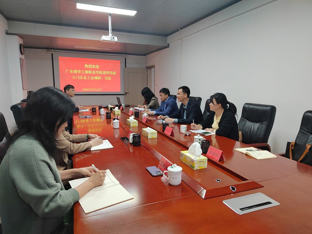 在斗门区总工会,调研组详细了解了斗门区总工会职工服务“五大行动”并就斗门区产业工人队伍建设模式进行深入交流。双方表示后续双方要进行资源整合互补,加强合作,共同为斗门区职工提供更多元化、更高质量的技能培训服务,助力产业工人队伍建设。