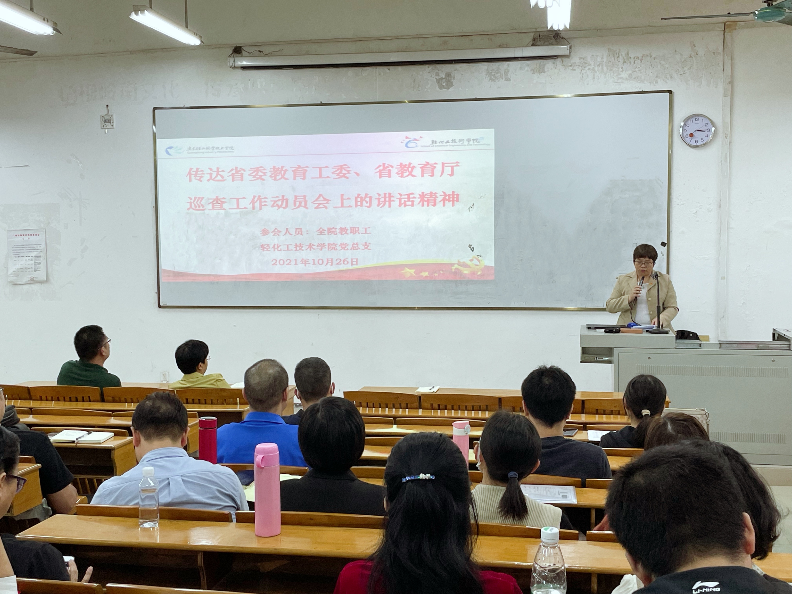 在党史学习教育取得阶段成效的基础上,10月26日下午,轻化工技术学院召开党史学习教育推进会,对党史学习教育再动员、再部署、再推进、再落实。学校党委委员、副校长李荣出席并指导工作,全院教职员工共100余人参会,会议由学院党总支书记谢彩英主持。