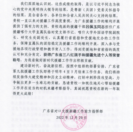 12月20日,广东省对口支援新疆工作前方指挥部向广东省外语艺术职业学院发来感谢信,感谢学校一直以来对援疆工作的高度重视和大力支持,尤其对选派的援疆干部、外语外贸学院教工党支部优秀党员吕佩玉同志的援疆工作表示高度赞扬和充分肯定。
