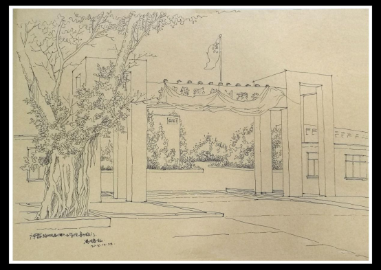 ▲《广舞戏新校门》牛皮纸签字笔手绘速写