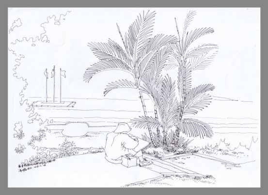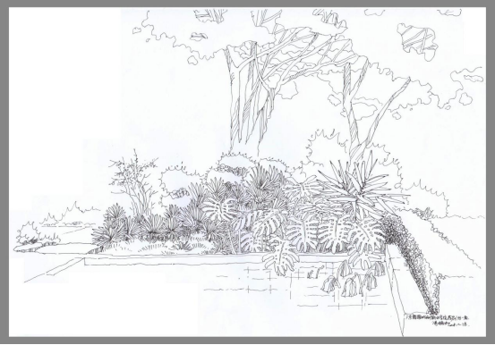 ▲《广舞戏荷花池一角》白纸签字笔手绘速写