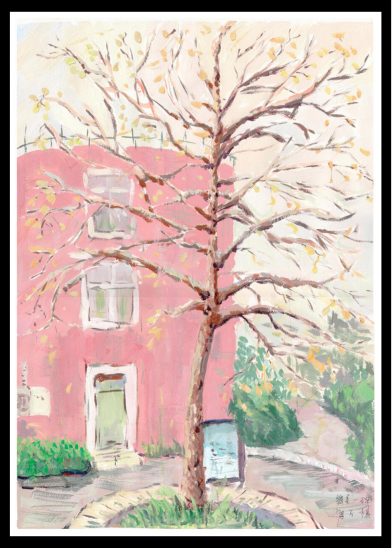 ▲《广舞戏校训楼》牛皮纸签字笔手绘速写