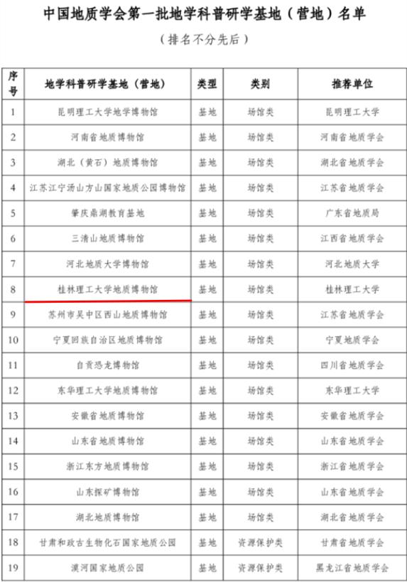 近日,中国地质学会公布了第一批地学科普研学基地(营地)的名单(地会字〔2020〕51 号),我校地质博物馆名列其中,被命名为“第一批地学科普研学基地(营地)”。