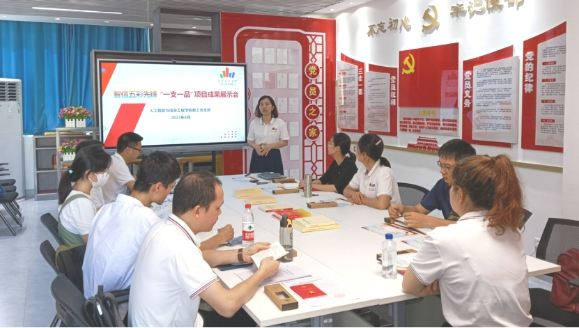 “智信五彩先锋”是以建“智信红”思政先锋团队,铸“德高红心”;赋“智信蓝”科技先锋能量,育“能强匠心”;奉“智信绿”环保先锋理念,献“尚劳爱心”;办“智信橙”实践先锋实事,守“技精诚心”;创“智信紫”宣传先锋品牌,强“报国信心”。展示活动分别从“思政先锋——立德树人,培根铸魂”,“科技先锋——素质教育,科教兴国”,“实践先锋——丰富理论,提升觉悟”三个板块展示了人工智能与信息工程学院教工党支部在开展思政教育、主题党课、深化理论学习、支部建设、志愿服务、创新活动等党建工作方面的成就,充分展示了支部的特色和风采,传递了党员先锋模范的精神和正能量。