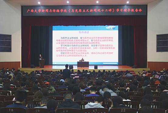 3月19日,广西大学新闻与传播学院院长、中国人民大学新闻学院博士生导师郑保卫教授在广西大学大礼堂为新闻与传播学院全院师生作了一场深入浅出、生动活泼的《马克思主义新闻观十二讲》学习辅导报告。这是该书出版发行以来,作为教材主编的郑保卫教授在高校做的首场学习辅导报告。学院1000多名师生听取了报告。报告会由刘洪常务副院长主持。