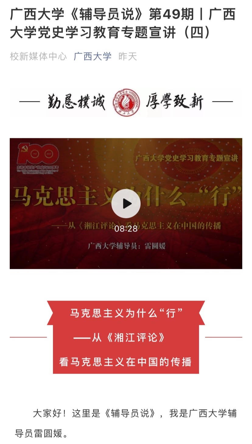 广西大学新闻与传播学院党委积极贯彻落实学校《关于开展“四史”学习教育的通知》,发挥学科特色和优势,激发学院师生学好用好“四史”的热情,用习近平新时代中国特色社会主义思想铸魂育人,把开展“四史”学习教育纳入学院教育教学科研全过程,打通育人“最后一公里”,推动“四史”学习教育走深走实。