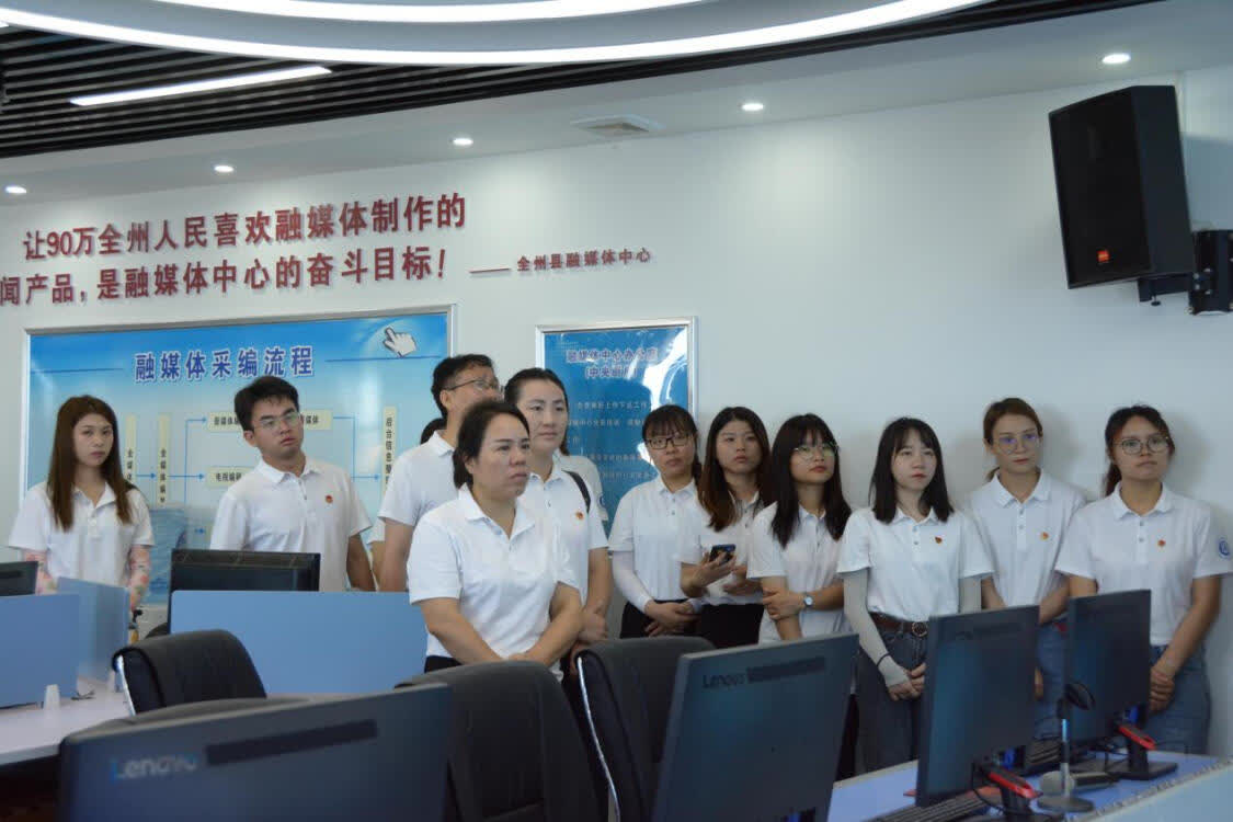 揭牌仪式后,师生们在全州县融媒体中心“中央厨房”观看了关于全州的系列报道优秀作品,听取了融媒体中心全媒体记者的经验分享。唐兴还从学术研究的第三方视角,就自媒体与主流媒体互动助力政务宣传取得良好效果进行了分析交流。随后,师生们参观了全州县融媒体中心演播室、制作室。
