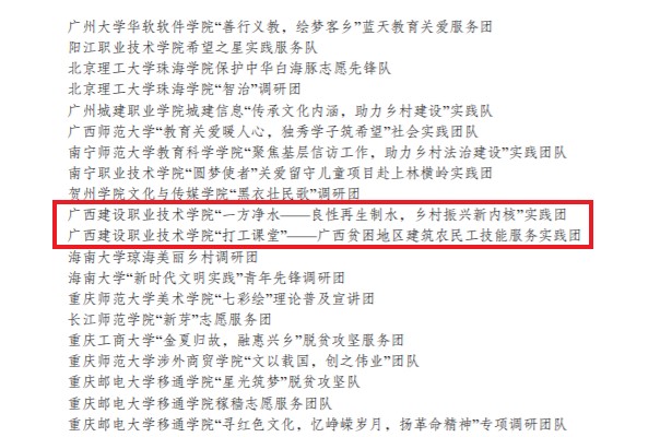 我系“打工课堂--广西贫困地区建筑农民工技能服务”实践团及“一方净水--良性再生制水,乡村振兴新内核”实践团两支队作为学院团委重点立项团队,在这次全国成果遴选活动中,喜获2020年镜头中的三下乡优秀视频团队。其中,“一方净水”团队曾华华同学获优秀通讯员荣誉称号;指导老师段春毅获得优秀指导教师的荣誉称号。