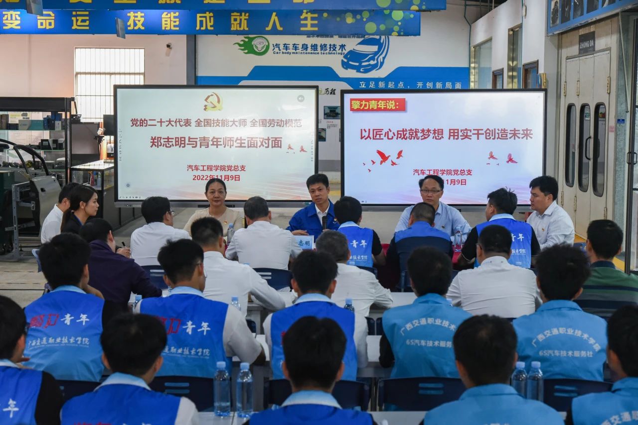 党的二十大代表、全国技术能手、全国劳动模范郑志明走进汽车工程学院实训车间为师生们讲授思政课