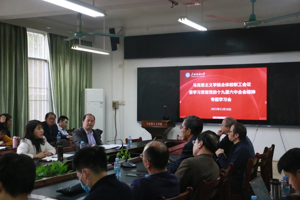 11月16日下午,马克思主义学院于求是楼307会议室召开全体教职工会议暨学习贯彻党的十九届六中全会精神专题学习会,传达学习党的十九届六中全会精神。