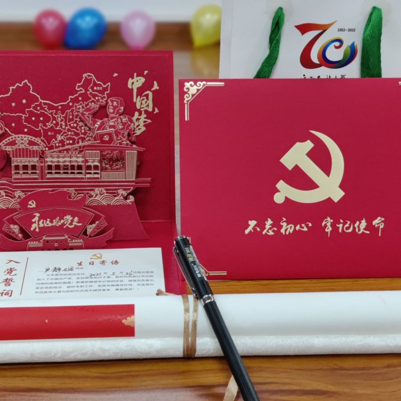 “今天你生日,送上我祝福,未来的日子每个梦想都实现......”随着音乐响起,全体党员围在缀满党员姓名的大蛋糕前一同齐唱《生日祝福歌》,一起过党员集体生日,现场欢声笑语,暖意融融。接着,党支部给全体毕业生党员赠送政治生日贺卡,寓意坚守初心;赠送黑色纪念笔和长幅毛笔字卷勉励毕业生党员笔耕不辍,前途有光。
