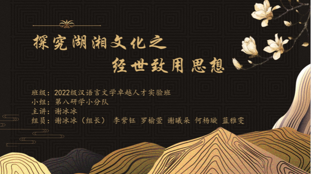 在“湖湘流脉”主题部分,来自22级卓越班的三个研学小组,分别作了题为《探究湖湘文化之经世致用思想》《以周敦颐为例探析湖湘文化的儒家文化语境》《韩少功作品与湖湘文化》的研学报告。黄焱和覃麒谕的感怀散文情思隽永,苏珂可的一首《访湖湘》荡气回肠。