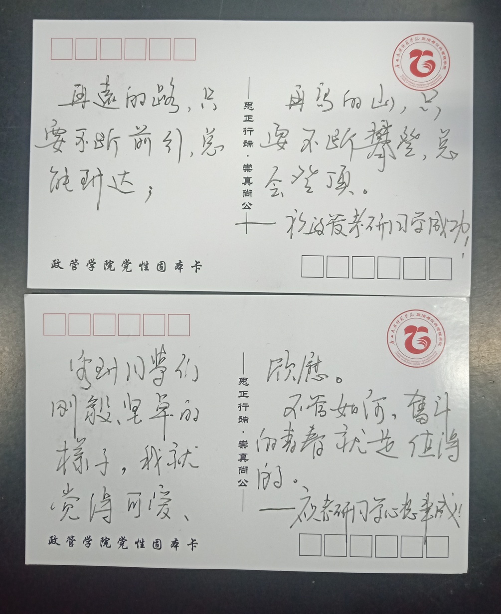 其中学校党委书记梁远海教授亲自书写了两封贺卡赠给17级考研学生党员,贺卡内容写道:“再远的路,只要不断前行,总能到达;再远的山,只要不断攀登,总会登顶;同学们刚毅、坚卓的样子,我觉得可爱、欣慰,不管如何,奋斗的青春就是值得的。”以此鼓励大家在研路在冲刺阶段能不忘初心,砥砺前行,争取最后胜利。
