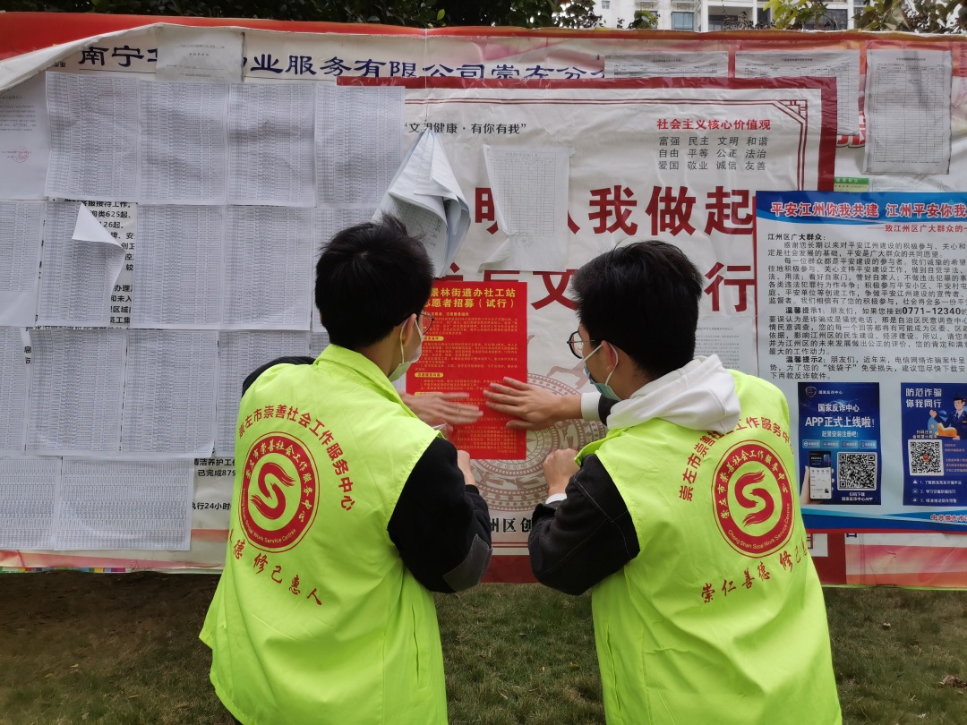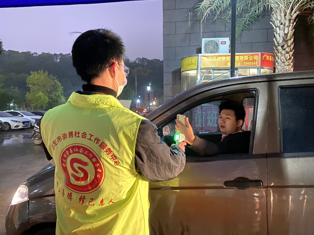 近日,崇左市江州区石景林街道办社会工作服务站在崇左市民政局、江州区民政局、石景林街道党工委的支持和指导下,崇左市崇善社会工作服务中心(以下简称 崇善社工)社工组织街道内各党员、热心居民参与到友谊社区、丽金社区疫情防控值守志愿服务活动中,积极发挥社工站在疫情防控和社区治理的作用,为社区疫情防控提供了安全保障。