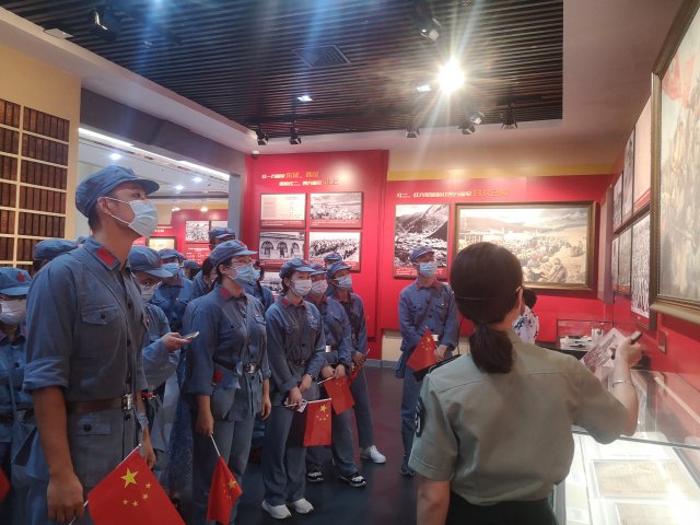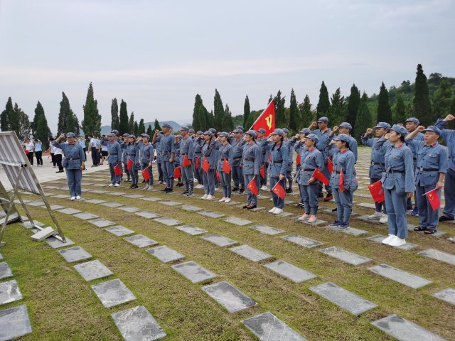 7月31日,师生们统一身着蓝色红军装来到全国爱国主义教育基地——桂林市全州县红军长征湘江战役纪念园。在纪念馆内,全体党员时而凝神倾听,时而驻足观看,透过一件件文物,一张张图片,一个个雕塑,追寻历史痕迹,共同追溯湘江战役的“红色之路”,回顾当年共产党人在湘江战役中的壮烈情景,缅怀烈士,铭记历史,坚定信仰。接着,党员同志们迈步走向凭吊广场。在凭吊广场,举行了庄严肃穆的缅怀悼念仪式,重温入团誓词,坚定理想信念。