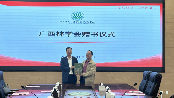 陈代喜理事长通报了学会第九届理事会任职以来的工作情况及取得的成效。他表示,学会正在积极推进团体标准制定、职称评审、成果评价与奖励、教育培训等工作,希望生态学院能够发挥优势,参与到学会的各项活动中来,并提供专家支持;同时鼓励更多教师、学生参加明年将要举行的“广西林业青年科技创新论坛”和“第二十六届中国科协年会”等活动,进一步拓宽双方的合作领域。宋毅克常务副理事长也就项目评审、技术培训、自然教育等方面的合作提出了意见和建议。陈代喜理事长向广西生态工程职业技术学院赠送专业书籍《广西杉木良种选育与高效栽培》。