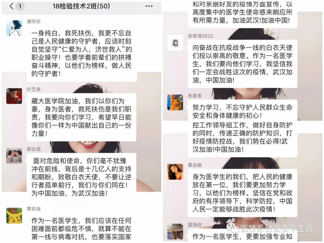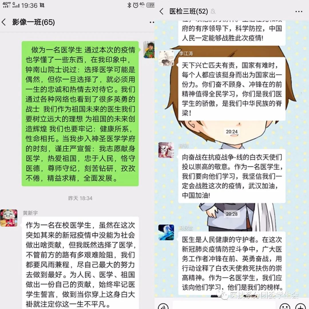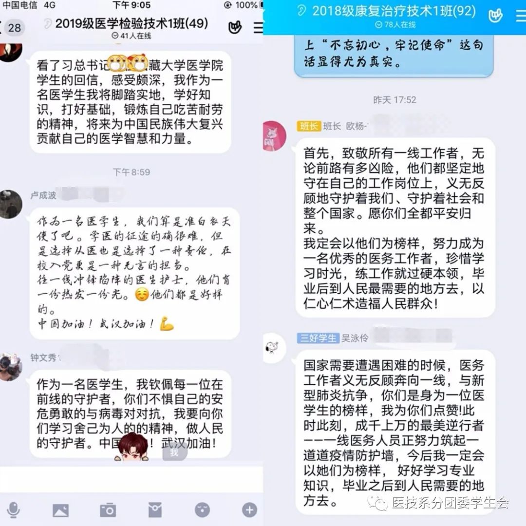 在这个非常时期,习总书记的回信对广大医学生、广大奋战在抗疫一线的医务工作者也产生了极大鼓舞和激励。2月24日,在新学期开学之际,医技系分团委组织各团支部开展线上团课,组织广大团员青年学习习总书记回信并引发热烈反响。