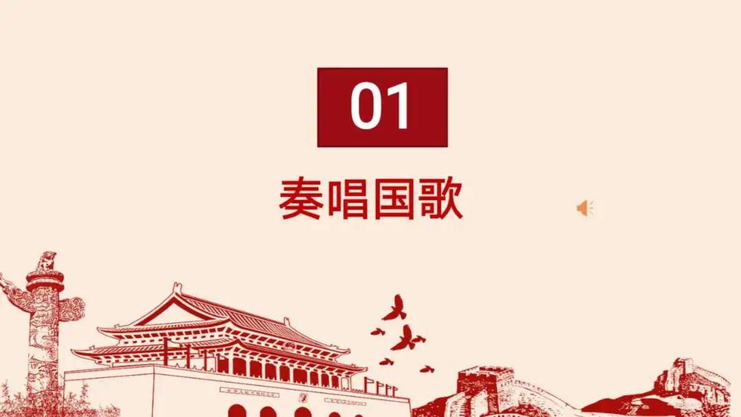 全体起立,奏唱国歌。虽是线上视频会议,但依然庄重肃穆。