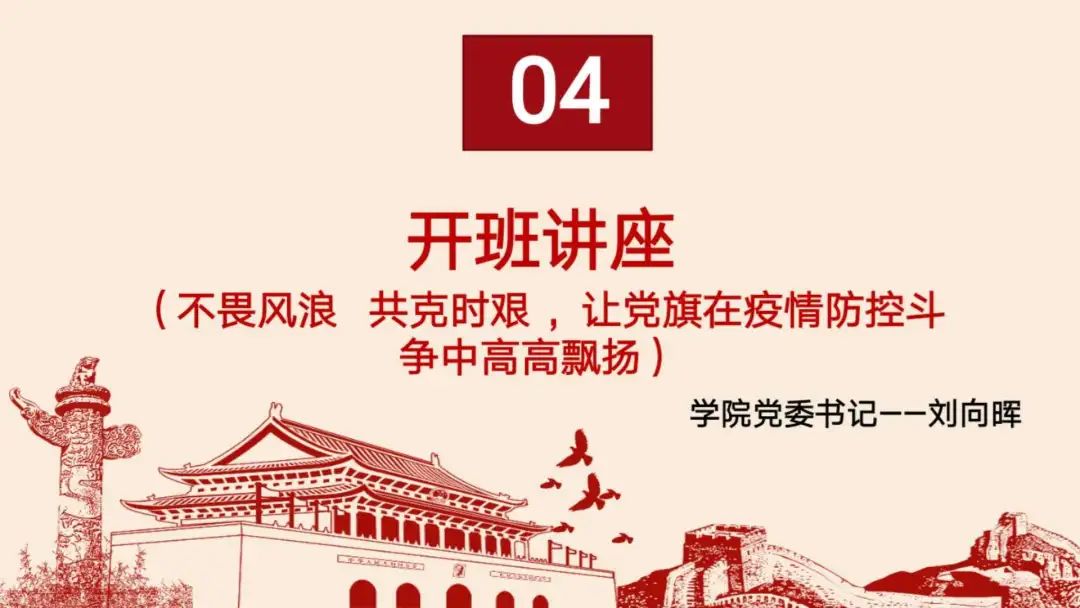 刘向晖书记的开班讲座:不畏风浪 共克时艰,让党旗在疫情防控斗争中高高飘扬,以疫情防控为主题,结合习近平总书记重要指示和疫情期间发生的感人事迹等,从五个方面进行讲解,让我们懂得了应当强化健康生活、学习实践、理性分析的能力,提升敬畏自然意识、生命意识、人类命运共同体意识和家国意识。内容深刻,富有含义,给入党积极分子们以榜样式的启迪。刘书记给党员和入党积极分子提出四点要求: