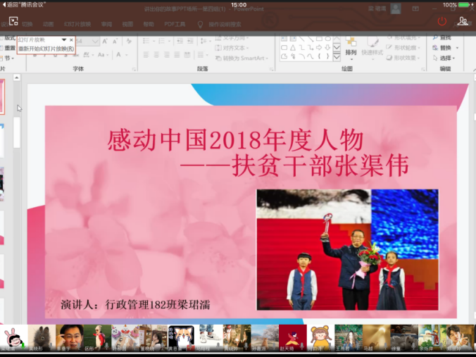钟洁芸向疫情防控一线的工作人员郝鹏表示致敬;梁钧濡为大家介绍了感动中国2018人物——扶贫干部张渠伟,宁愿双目失明,誓要群众脱贫;李文静则讲述了疫情期间发生的平凡而又温暖的小故事,朱风铃同样关注着疫情期间的“平凡天使”;陈冰莹带大家了解了疫情期间的志愿者故事,徐童也向大家分享疫情之下的“志愿精神”。
