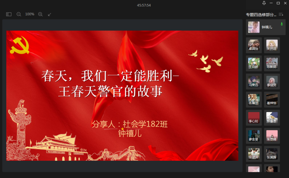 唐夏依:讲述了爷爷与她的故事,向同学们介绍了爷爷的军旅生涯,爷爷始终坚守岗位,是一位优秀的劳动模范,在这次疫情中也积极捐款,目前党龄为52年。她表示爷爷是自己学习的榜样和标杆。