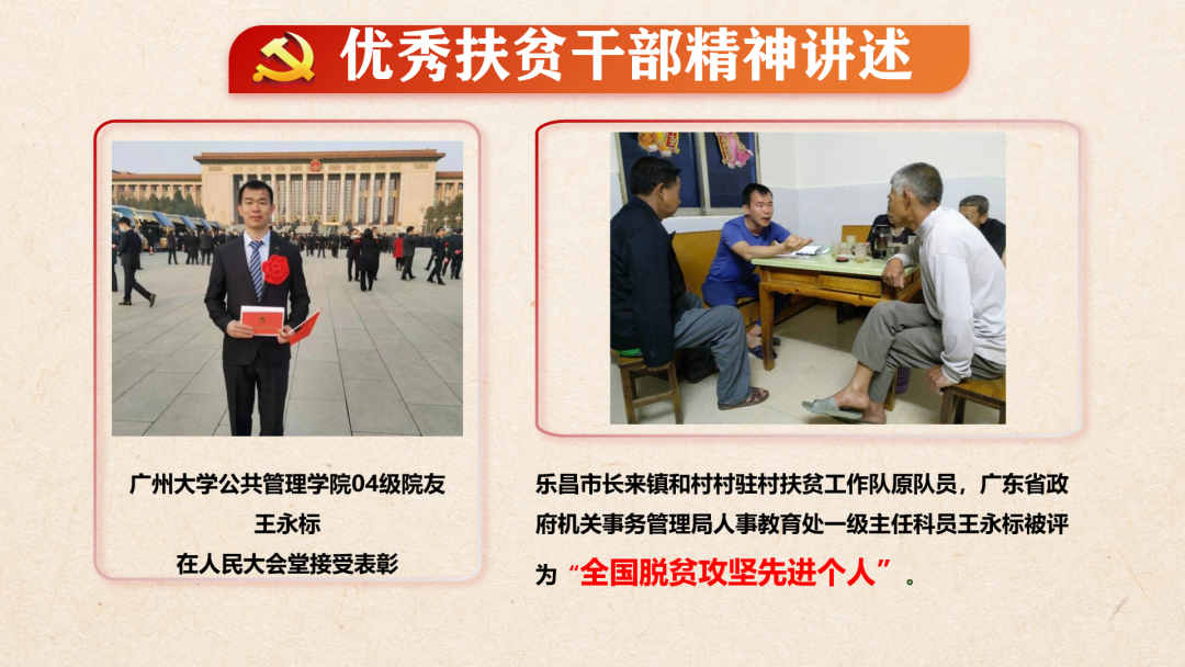 2021年10月21日,广东省教育厅公布高校思政课党史教育优质课例和大学生讲党史公开课展示活动结果,由广州大学公共管理学院党委书记刘向晖、党委副书记万朝春、本科生党支部书记刘志东指导,学院本科生党支部学生党员杨景昊、许缘、黄昊、李泓霓、危安平、莫金沙参与制作的“投身脱贫攻坚,师生党员在行动”主题党课荣获广东省高校大学生讲党史公开课展示活动三等奖。